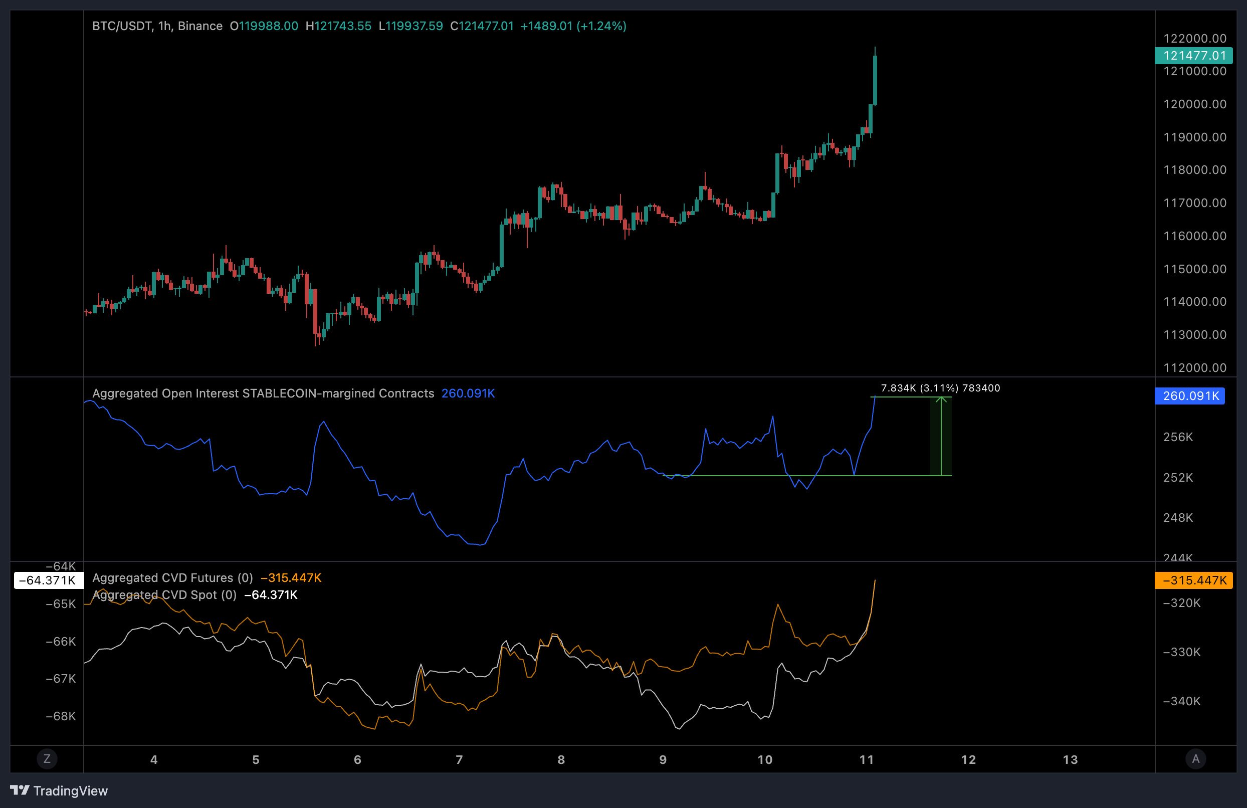 O interesse em aberto também aumentou em 7.834 BTC, juntamente com uma alta nos volumes de compra à vista em opções perpétuas, mostram dados da plataforma de derivativos Coinalyze, com sinais de que o movimento foi impulsionado principalmente pelo posicionamento especulativo comprado.