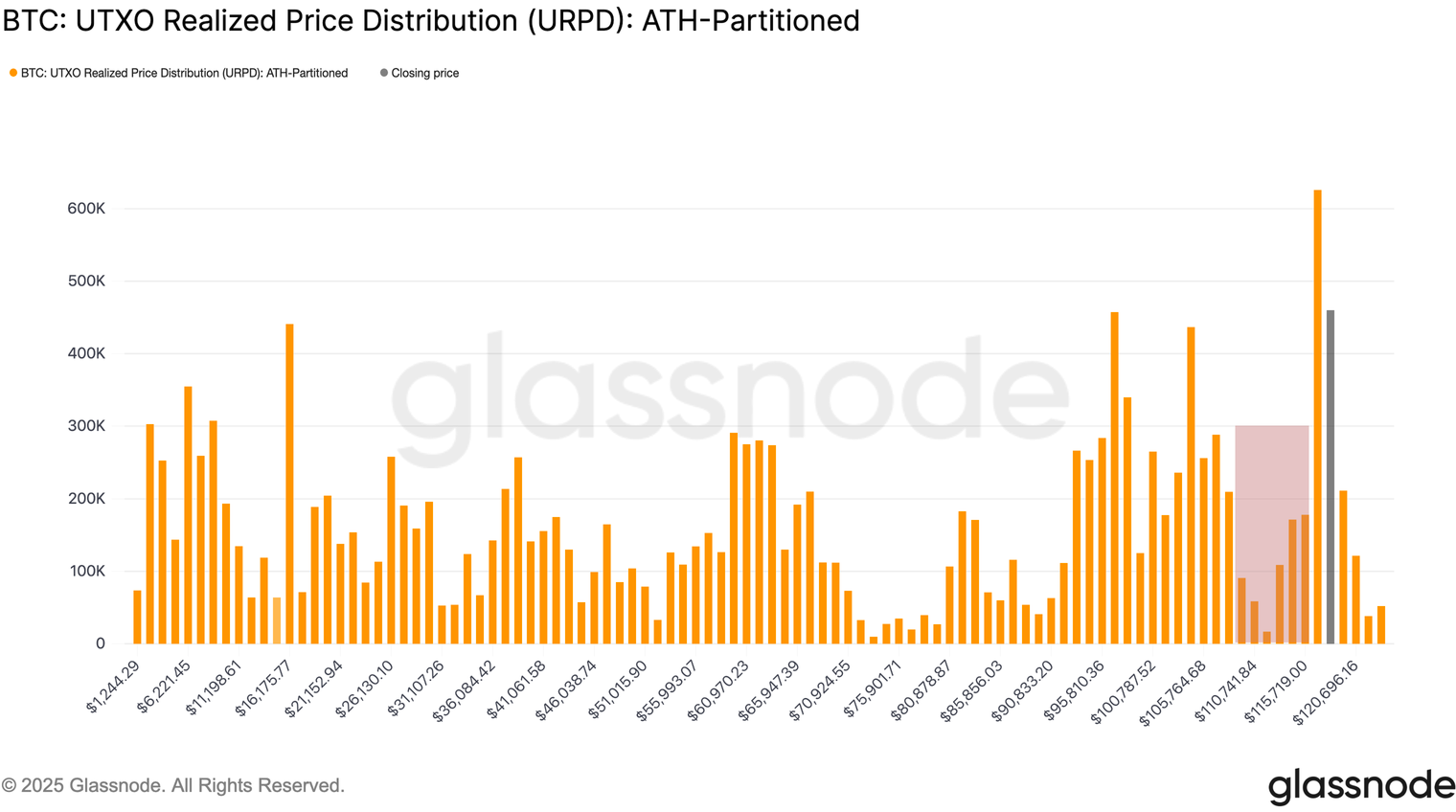 De acordo com a empresa de análise de blockchain, desde o topo histórico, o Bitcoin entrou em um movimento volátil, caindo até US$ 108 mil antes de se recuperar para o patamar atual. A métrica de distribuição de preço realizado (URPD) mostra que investidores aproveitaram a queda para acumular na faixa entre US$ 108 mil e US$ 116 mil — um comportamento considerado construtivo no longo prazo.