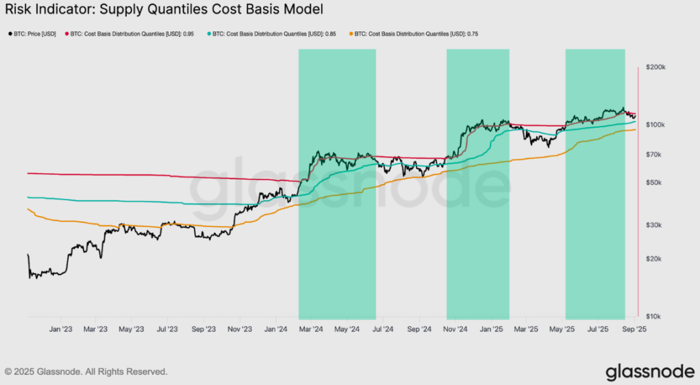 “O limite do custo de 0,95 mostra quando 95% da oferta de Bitcoin está em lucro, um sinal típico de fases de euforia. Essa condição durou cerca de três meses no último rali, mas perdeu força em 19 de agosto, quando o preço voltou a ficar abaixo desse patamar.”, explicou a Glassnode. No gráfico, a linha vermelha.